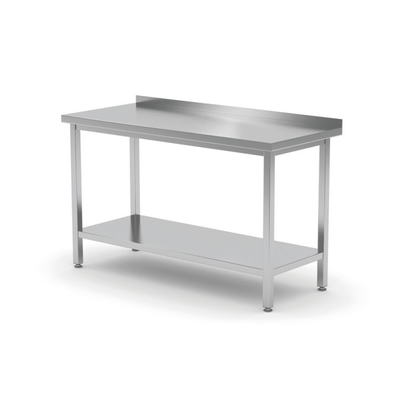 Dieser Tisch ermöglicht dank seines unteren Regals die Reduzierung von Unordnung im Arbeitsbereich und erleichtert den schnellen Zugriff auf notwendige Geräte. Das Fehlen eines Spritzschutzes bietet Flexibilität bei der Installation in verschiedenen Raumtypen und Küchenkonfigurationen.