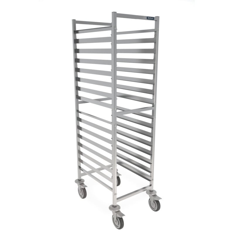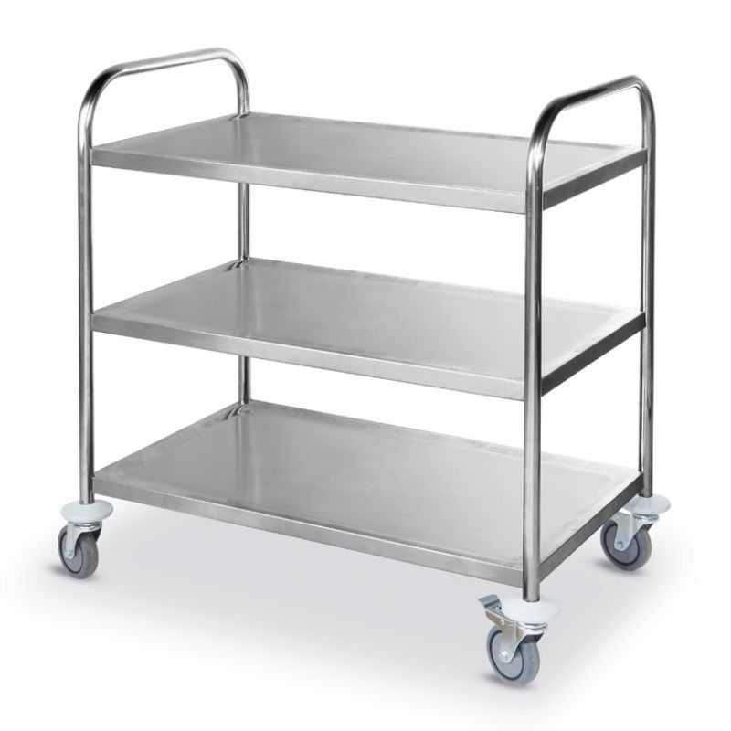 Dieser Servierwagen ist vollständig aus Edelstahl gefertigt. Er ist mit 4 Rollen ausgestattet, von denen zwei über Bremsen und Eckschutz verfügen.