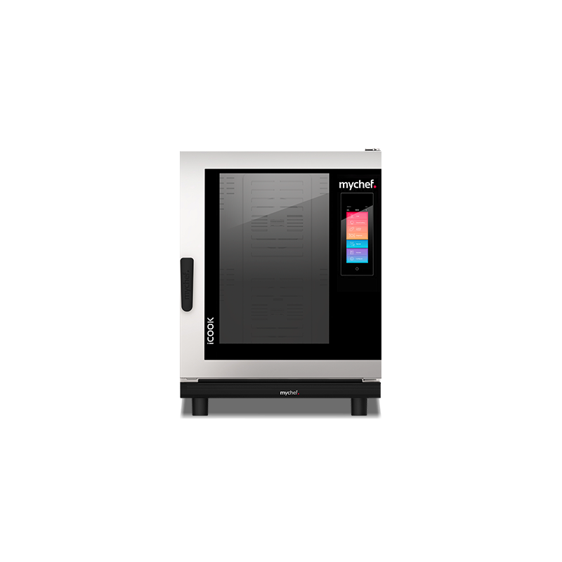 It has the following functions: ventilated air, steam cooking, combined steam cooking, low-temperature cooking, delta-T cooking, fan rotation reversal, and steam production by direct injection. It does not have a cleaning system and operates electrically with touch control.